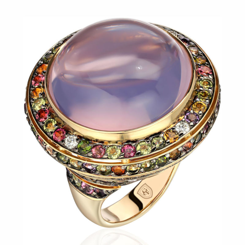 Кольцо из желтого золота 585 пробы с цитринами, турмалином, аметистом, хризолитами, кварцем и бриллиантами 01К6312182-2