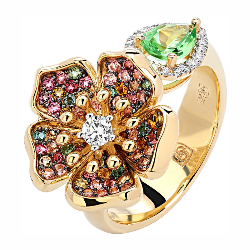 Кольцо из желтого золота 585 пробы с турмалинами, тсаворитом и бриллиантами 01К6313475-3