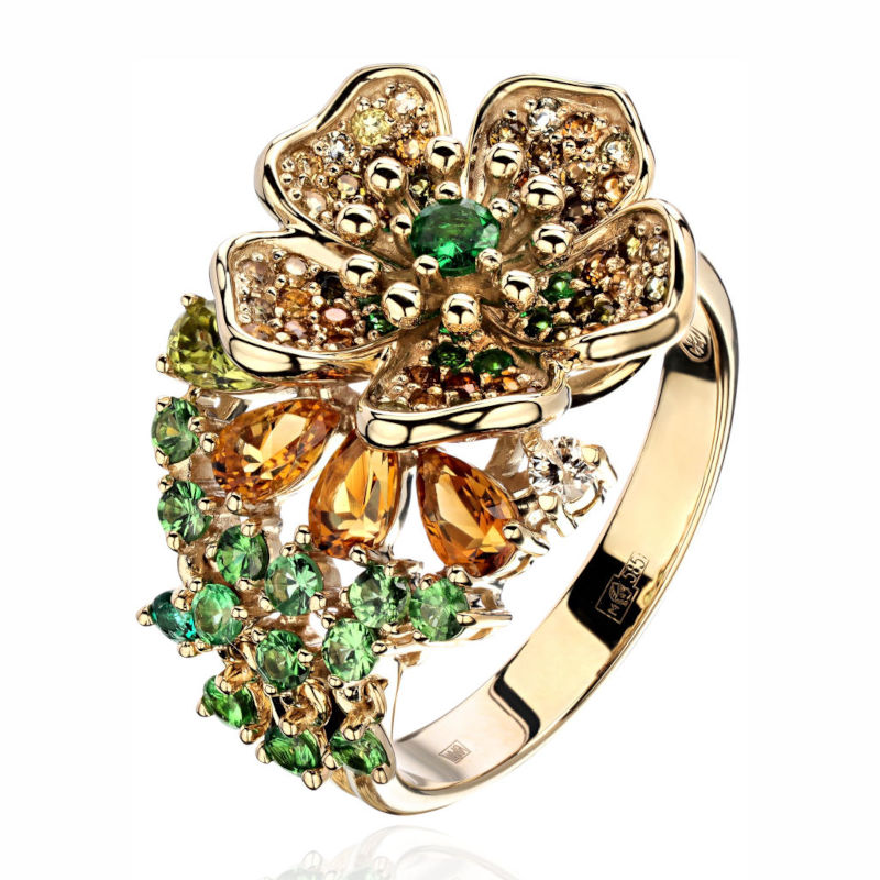 Кольцо из желтого золота 585 пробы с хризолитом, цитринами, турмалинами, тсаворитами и бриллиантом 01К6313476-2