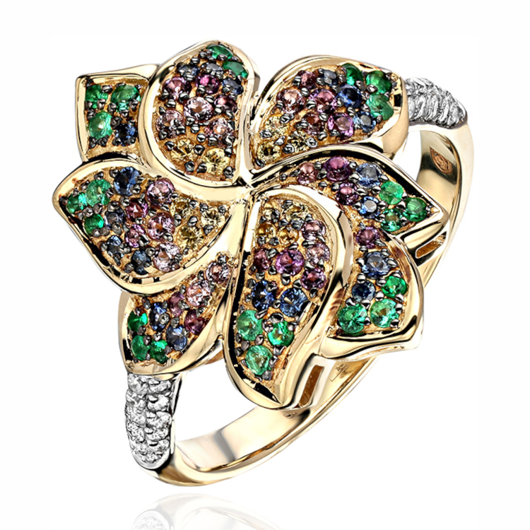 Кольцо из желтого золота 585 пробы с сапфирами, изумрудами, аметистами и бриллиантами 01К6314322-1