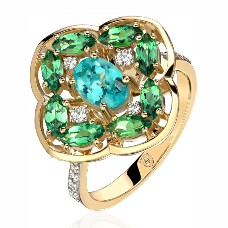 Кольцо из желтого золота 585 пробы с апатитом, тсаворитами и бриллиантами 01К6314777-1