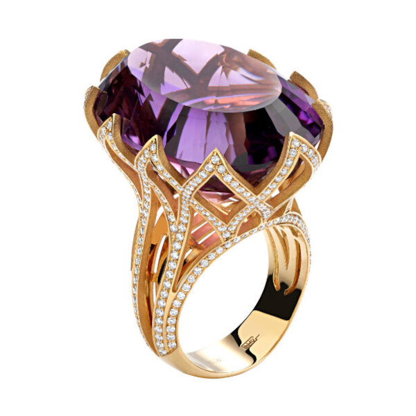 Кольцо из желтого золота 750 пробы с аметистом и бриллиантами 01К646683-1