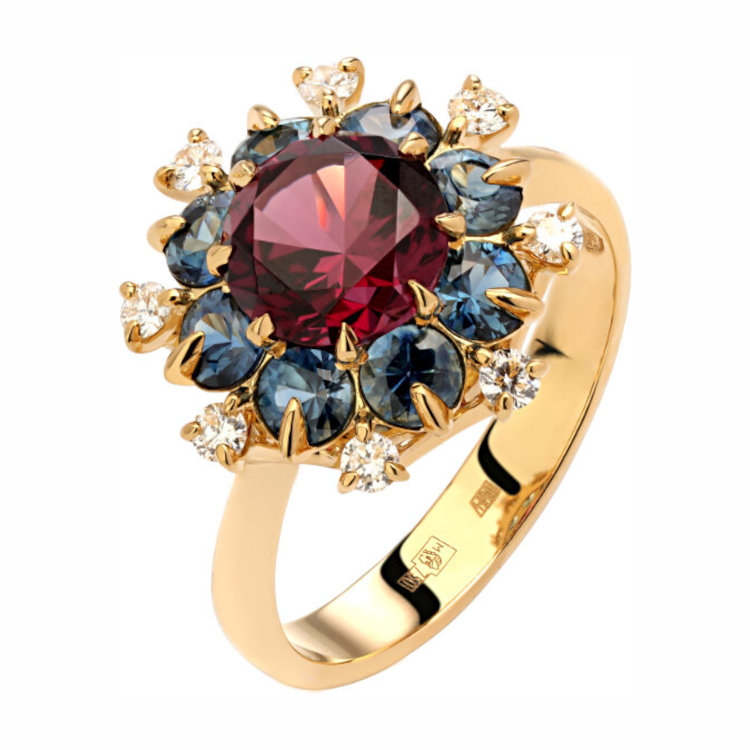 Кольцо из желтого золота 750 пробы с сапфирами, родолитом и бриллиантами 01К647693-1