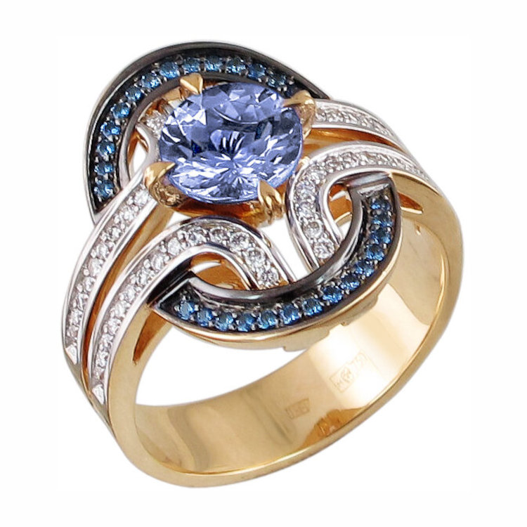 Кольцо из желтого золота 750 пробы с танзанитом, сапфирами и бриллиантами 01К649723-2