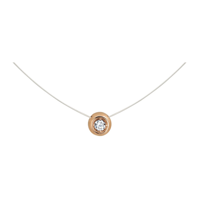Необычное украшение – колье на леске-невидимке из красного золота 585 пробы с фианитом. Визуальное впечатление отсутствия цепочки придает особую легкость и нежность Вашему образу. Невесомая, будто парящая в воздухе подвеска смотрится оригинально и очень изящно. В украшении много воздуха, свободы. Аксессуар подчеркнет одну из самых притягательных частей - женскую ключицу и плечи.