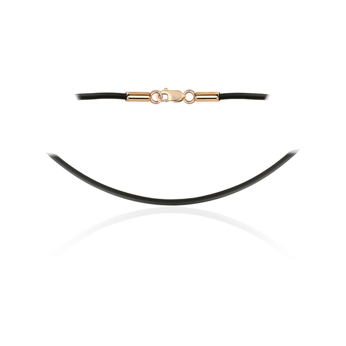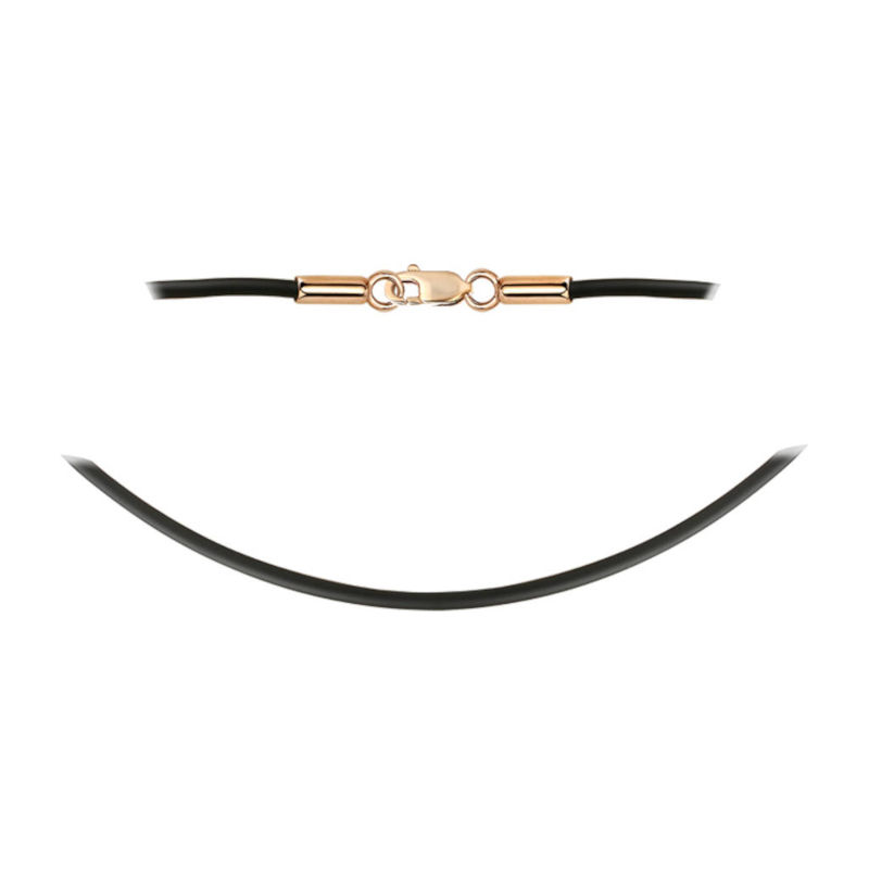 Колье на основе каучукового шнура с замком из красного золота 585 пробы. Особое украшение, которое полюбится и мужчинам и женщинам. Изделия из этого материала подходят для повседневной носки. Мягкая основа не царапает и не натирает кожу, не цепляется за одежду и волосы. Сочетайте грубые и нежные фактуры, дополняйте шнур различными подвесками и украшение будет каждый раз новым. Ширина шнура: 2 мм.