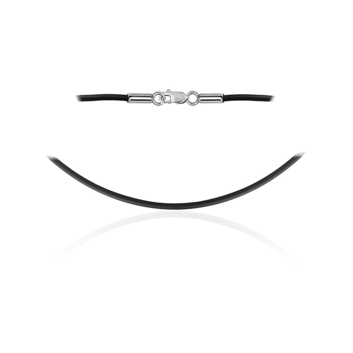 Колье на основе каучукового шнура с замком из белого золота 585 пробы. Особое украшение, которое полюбится и мужчинам и женщинам. Изделия из этого материала подходят для повседневной носки. Мягкая основа не царапает и не натирает кожу, не цепляется за одежду и волосы. Сочетайте грубые и нежные фактуры, дополняйте шнур различными подвесками и украшение будет каждый раз новым. Ширина шнура: 2 мм.