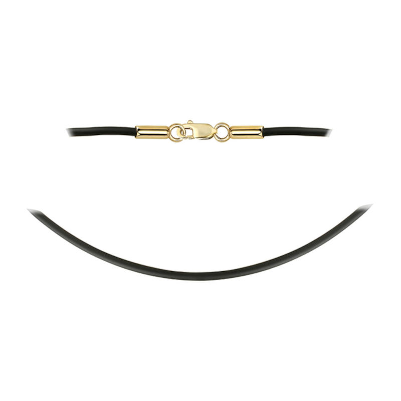 Колье на основе каучукового шнура с замком из желтого золота 585 пробы. Особое украшение, которое полюбится и мужчинам и женщинам. Изделия из этого материала подходят для повседневной носки. Мягкая основа не царапает и не натирает кожу, не цепляется за одежду и волосы. Сочетайте грубые и нежные фактуры, дополняйте шнур различными подвесками и украшение будет каждый раз новым. Ширина шнура: 2 мм.