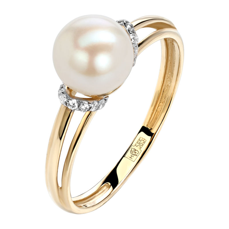 Кольцо из желтого золота 585 пробы с жемчугом и фианитами 01К3312956-1