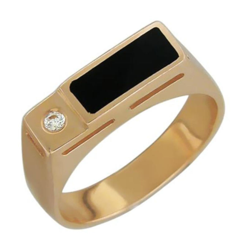 Печатка из красного золота 585 пробы с черным агатом и фианитом. Аксессуар, который сможет дополнить деловой образ или добавить немного брутальности повседневному стилю. Сочетание черного цвета и блеска драгоценного металла придется по душе владельцу сдержанного и элегантного стиля.