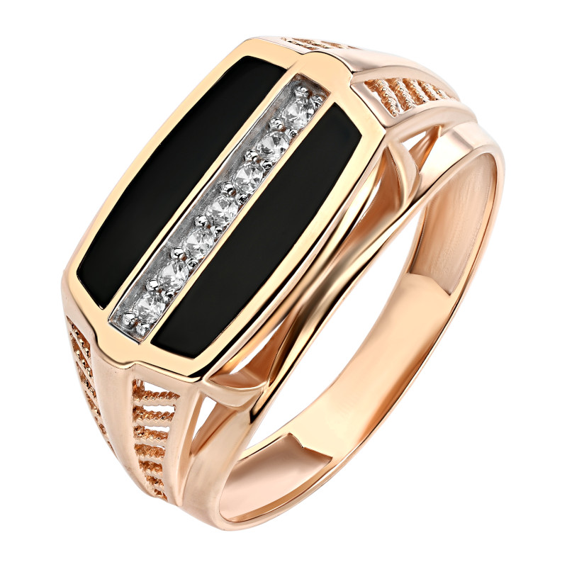 Печатка из красного золота 585 пробы с черным агатом и фианитами. Аксессуар, который сможет дополнить деловой образ или добавить немного брутальности повседневному стилю. Сочетание черного цвета и блеска драгоценного металла придется по душе владельцу сдержанного и элегантного стиля.