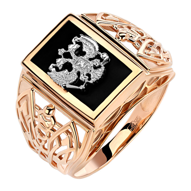 Печатка из двух цветов золота 585 пробы с черным агатом. Кольцо выполнено в красном цвете, накладка герб - в белом цвете. Аксессуар, который сможет дополнить деловой образ или добавить немного брутальности повседневному стилю. Сочетание черного цвета и блеска драгоценного металла придется по душе владельцу сдержанного и элегантного стиля.