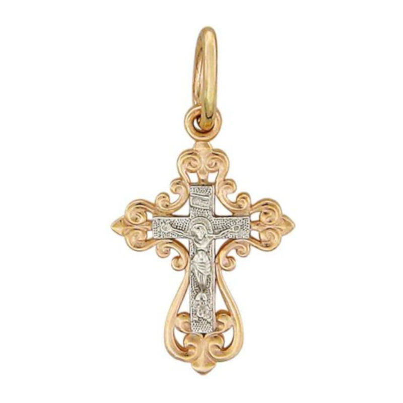 Крест нательный из двух цветов золота 585 пробы без вставок. Крест выполнен в красном цвете, распятие в белом. Подвеска крест – особенное ювелирное изделие. Этот важный христианский символ, выполненный из драгоценного металла, может стать замечательным подарком для верующего человека. Он несет на себе множество богословских символов и священных образов. Нательные крестики принято носить под одеждой.