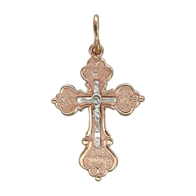 Крест нательный из двух цветов золота 585 пробы без вставок. Крест выполнен в красном цвете, распятие в белом. Подвеска крест – особенное ювелирное изделие. Этот важный христианский символ, выполненный из драгоценного металла, может стать замечательным подарком для верующего человека. Он несет на себе множество богословских символов и священных образов. Нательные крестики принято носить под одеждой.