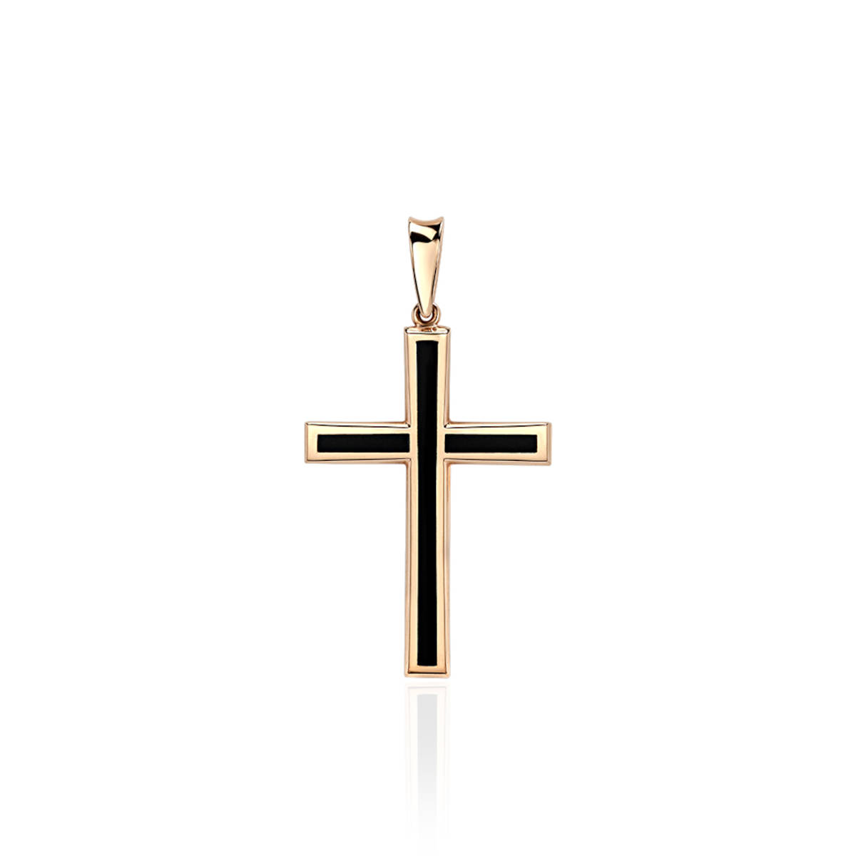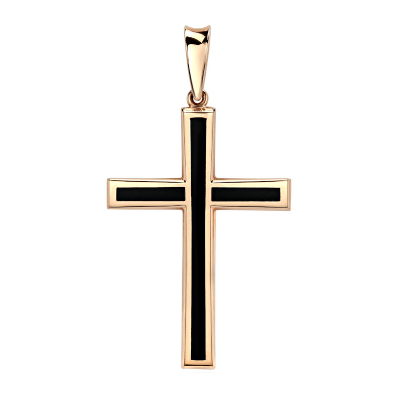 Декоративный крест из красного золота 585 пробы с черным агатом. Натуральные камни в обрамлении драгоценного металла несут в себе энергию, статус, цветотерапию. Украшение является инвистицией, так как вместе с драгоценным металлом используются натуральные вставки. Декоративные кресты берут начало от нательных. Отличие их в том, что они не имеют религиозной атрибутики. На них нет распятия и молитв. Они имеют более декоративный дизайн или усыпаны вставками. Их носят на виду, поверх одежды. Размеры В х Ш: 35.50 х 23.00 мм.