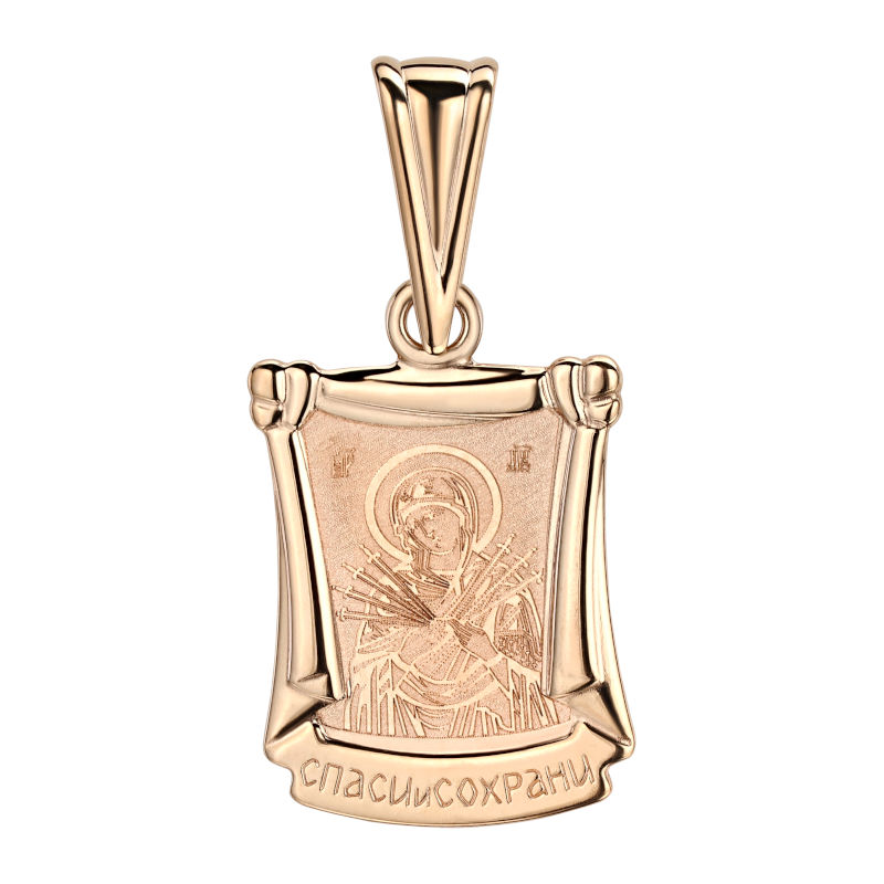 Подвеска из красного золота 585 пробы с религиозной тематикой несет глубокий смысл. Она символизируют принадлежность человека к определенной вере, поэтому обладают особой ценностью для своего владельца. На подвеске изображен образ Семистрельной Божией Матери.
