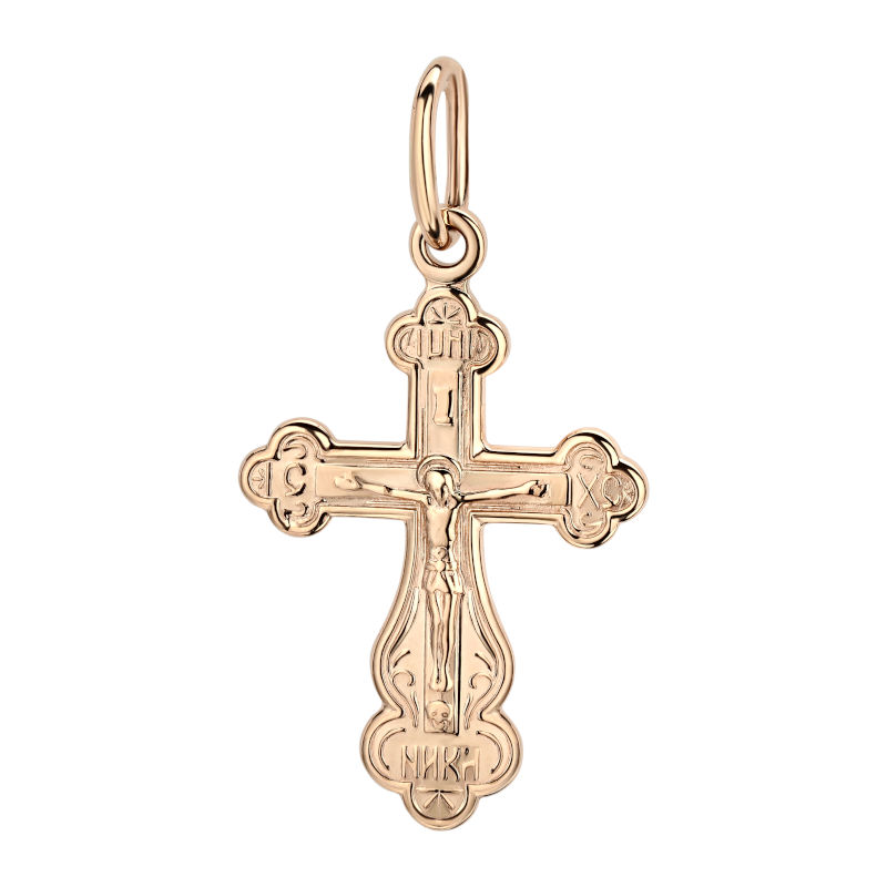 Крест нательный из красного золота 585 пробы без вставок. Подвеска крест – особенное ювелирное изделие. Этот важный христианский символ, выполненный из драгоценного металла, может стать замечательным подарком для верующего человека. Он несет на себе множество богословских символов и священных образов. Нательные крестики принято носить под одеждой. Размер В х Ш: 24.50 х 15.50 мм.