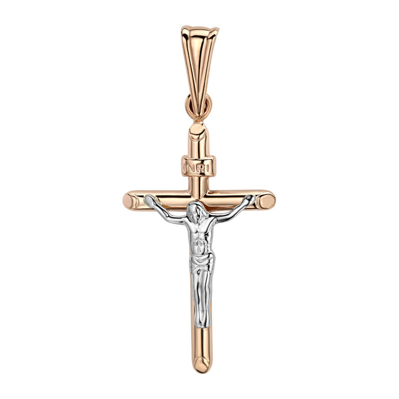 Крест нательный из двух цветов золота 585 пробы без вставок 01Р060657 из коллекции Религия. Изготавливаемый из красного и белого золота, он прекрасно сочетает в себе традиции и современность, придавая образу особую изысканность. Крест выполнен в красном цвете, распятие в белом. Полная высота изделия составляет 4 см, из них 1 см занимает кольцо для цепи. Размер самого креста — 3х1,9 см.