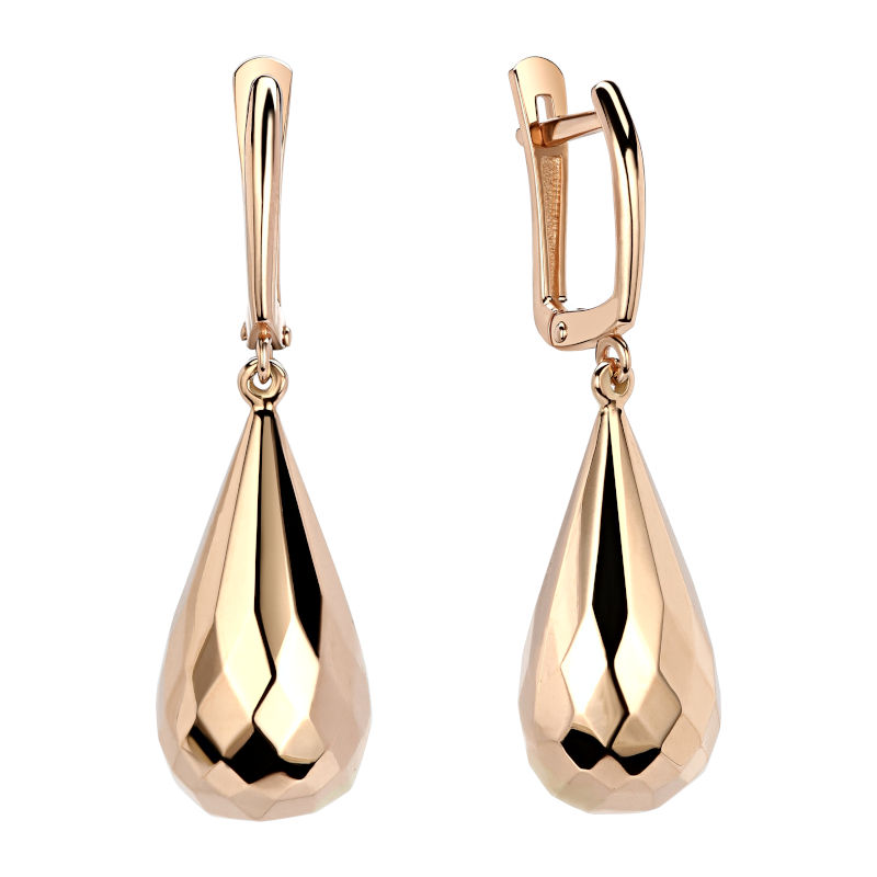 Серьги из красного золота 585 пробы без вставок с надежным английским замком привычны и любимы многими женщинами. Это базовое украшение с элегантным дизайном, очень комфортное в повседневной носке. Идеальный глянец золота одинаково хорошо сочетается как с повседневными образами, так и с роскошными нарядами. Зеркальный блеск благородного металла и отсутствие деталей приглянется любителям минимализма. Кроме того удачно дополнит гардероб любого стиля. Серьги из красного золота 585 пробы без вставок, выполненные в виде капель. Многогранная поверхность создает интересный визуальный эффект при падении света, придавая изделию особую изящность и элегантность. Эти женские серьги из красного золота отлично подчеркнут любой образ и подойдут для особых случаев или повседневного ношения.
