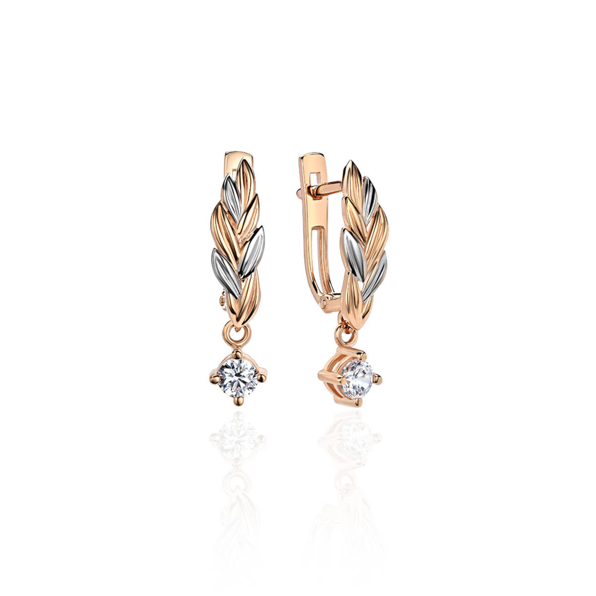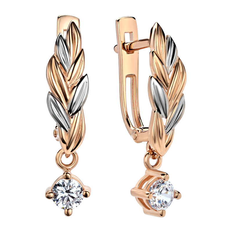 Серьги из красного золота 585 пробы с фианитами. Надежный английский замком привычен и любим многими женщинами. Это базовое украшение с элегантным дизайном, очень комфортное в повседневной носке. Фианит всего лишь был должен заменить алмаз для лабораторий. А получилось, что стал незаменимым атрибутом ювелирных украшений. Самыми популярными являются, конечно же, прозрачные фианиты. Они гармонируют совершенно с любым металлом, с любой формой изделия. Конструкция замка скроет дырку от прокола.
