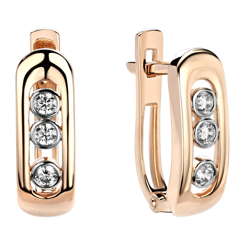 Серьги из красного золота 585 пробы с фианитами. Надежный английский замком привычен и любим многими женщинами. Это базовое украшение с элегантным дизайном, очень комфортное в повседневной носке. Фианит всего лишь был должен заменить алмаз для лабораторий. А получилось, что стал незаменимым атрибутом ювелирных украшений. Самыми популярными являются, конечно же, прозрачные фианиты. Они гармонируют совершенно с любым металлом, с любой формой изделия. Конструкция замка скроет дырку от прокола.