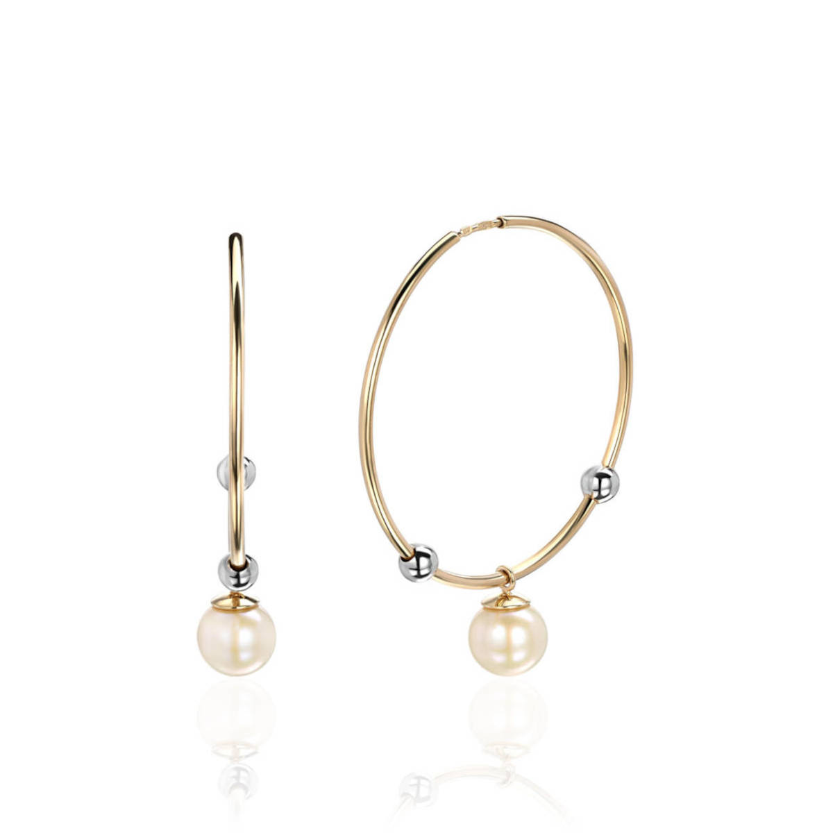 Серьги конго из двух цветов золота 585 пробы. Классическая модель из желтого золота украшена декоративными элементами – неподвижными шариками белого золота и подвесками с жемчугом.