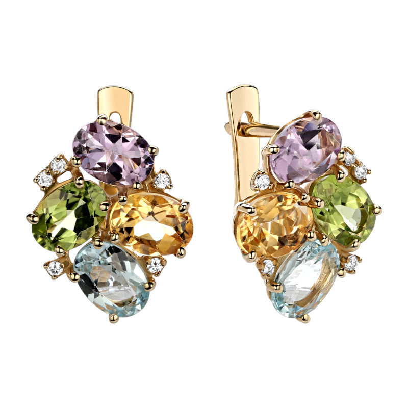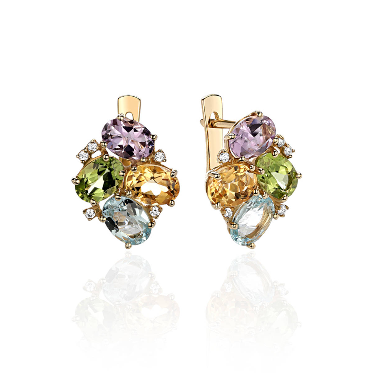 Серьги из желтого золота 585 пробы с цитрином, хризолитом, фианитами, топазом и аметистом 01С335667-1