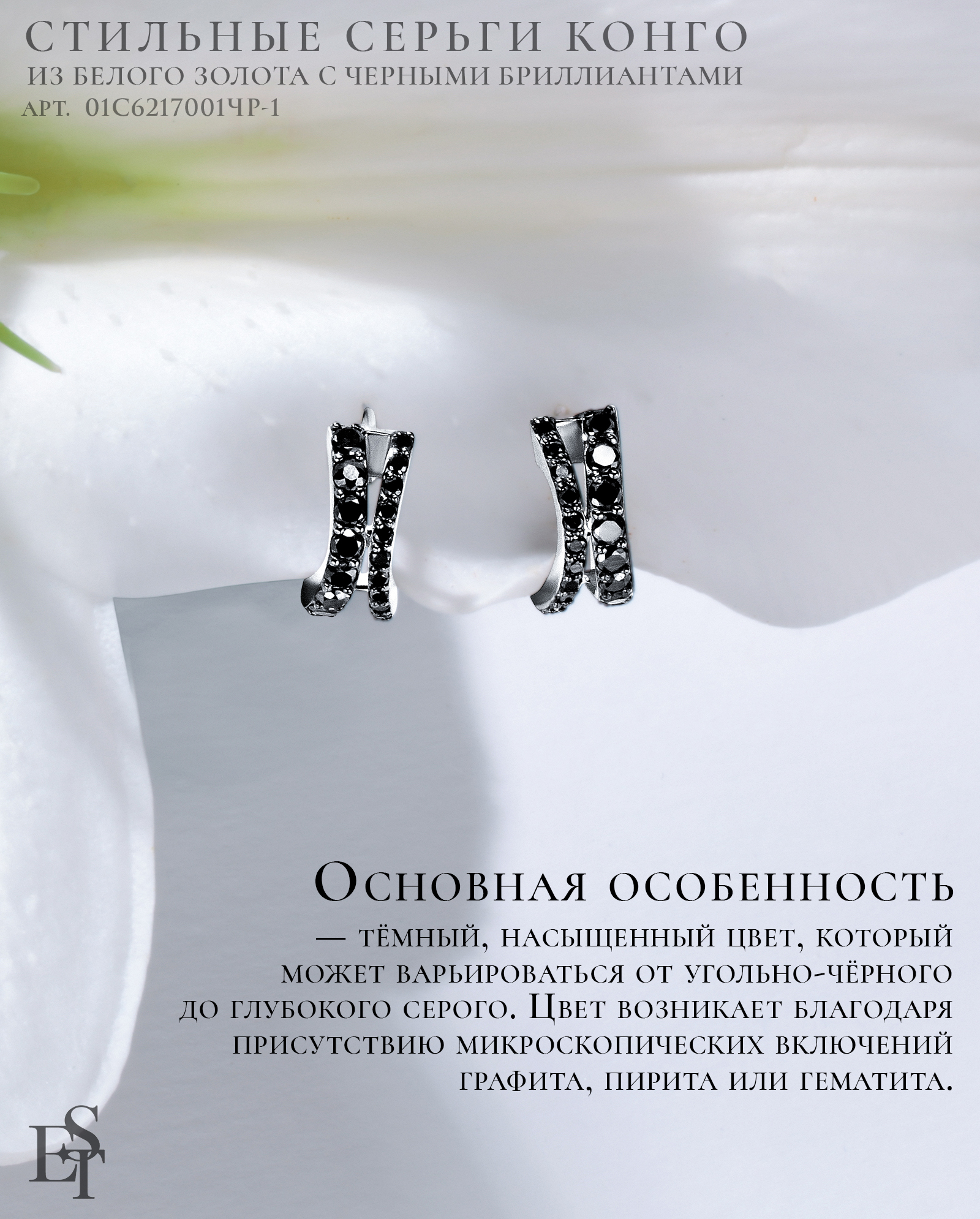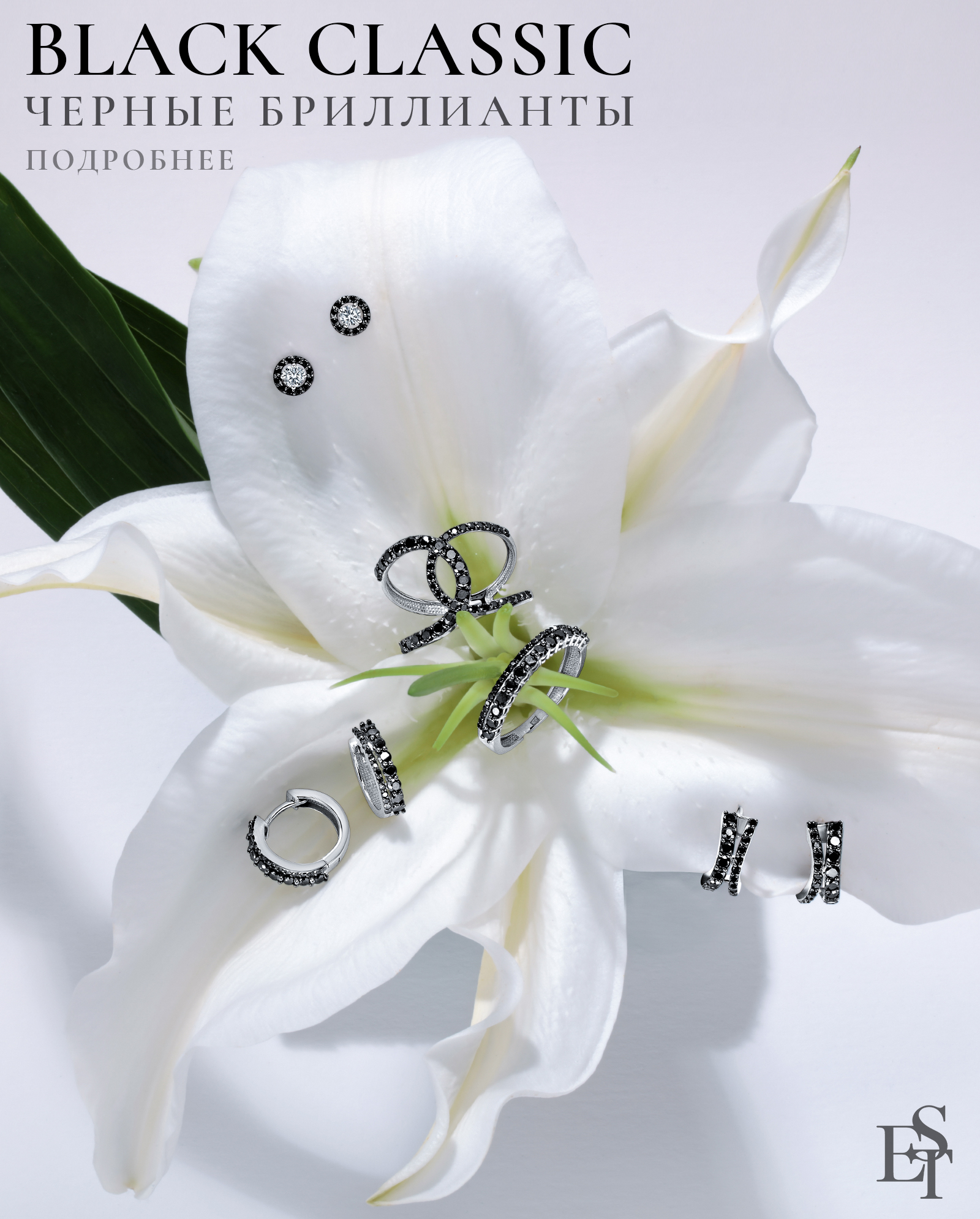 Черно-белое сочетание стало универсальной классикой, а бриллианты черного цвета символом вкуса и сдержанности. Их использование все чаще можно встретить в современных украшениях, они подчеркивают драматизм и графичность форм. Если прозрачный алмаз ассоциируется с традицией и чистотой, то черный — с силой, независимостью и внутренней глубиной. В коллекции Estet мы тоже добавили черные бриллианты в различных сочетаниях от классических до самых креативных. Если вы поклонник строгости и роскоши, этот камень вам понравится.