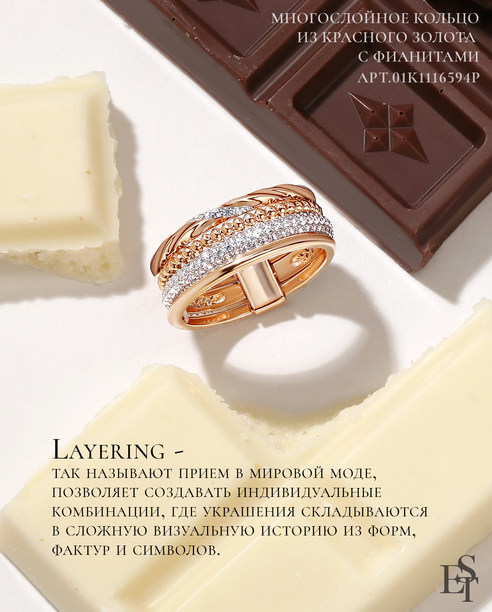 Для ювелирных домов это стало новым способом дизайна — они создают коллекции так, чтобы элементы работали вместе как система. Чтобы покупателям не ломать голову в попытках найти сложные сочетания, ювелирные дома создают легко комбинируемые между собой украшения в коллекциях или сразу одно акцентное украшение с эффектом многослойности. Ювелирный дом Estet тоже создал украшения с иллюзией нескольких в одном — всё для ваших креативных стильных образов.